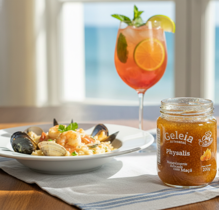 O sabor complexo e elegante do physalis – com suas notas tropicais e final levemente amadeirado – faz desta geleia um ingrediente versátil: experimente em torradas de pão brioche, como molho para carnes brancas ou até em cocktails premium.